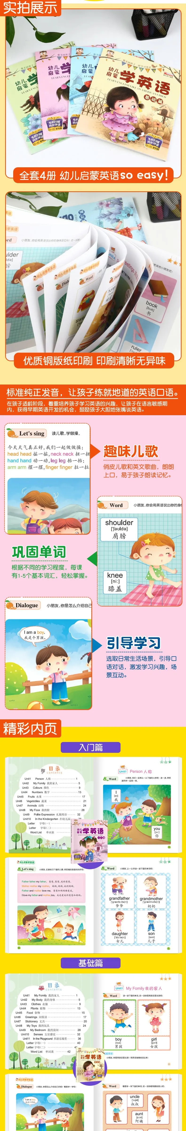 4pcs/set Baby Learn English Story book Infant English Enlightenment Materials easy to learn english book for children kids giftpages:44 pages/booksize:210x186mmAudience:Children/kids/baby(3-6 ages)package:4 book/set
