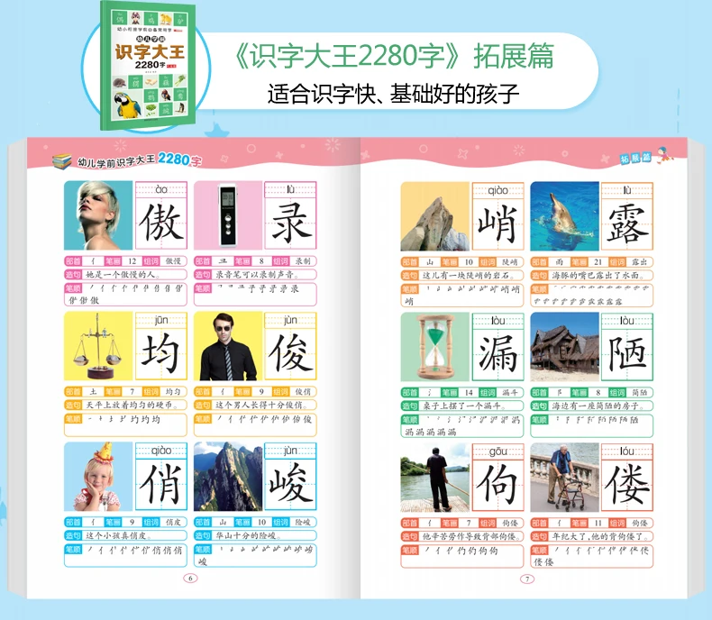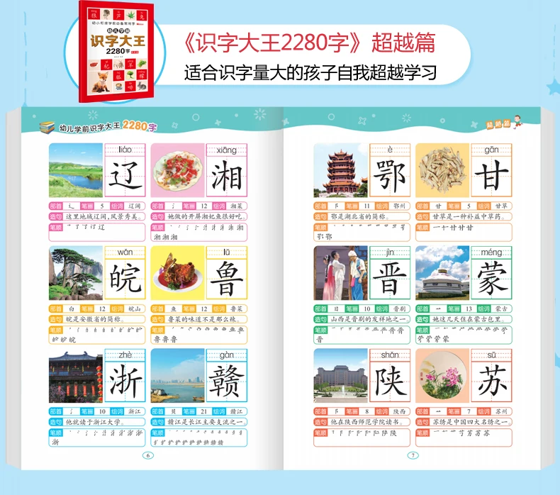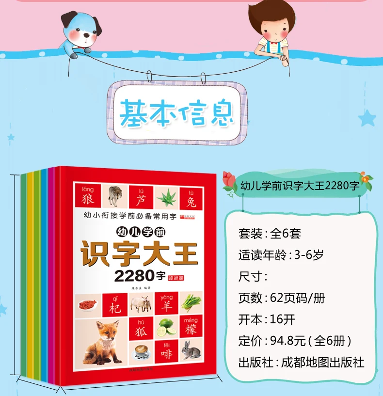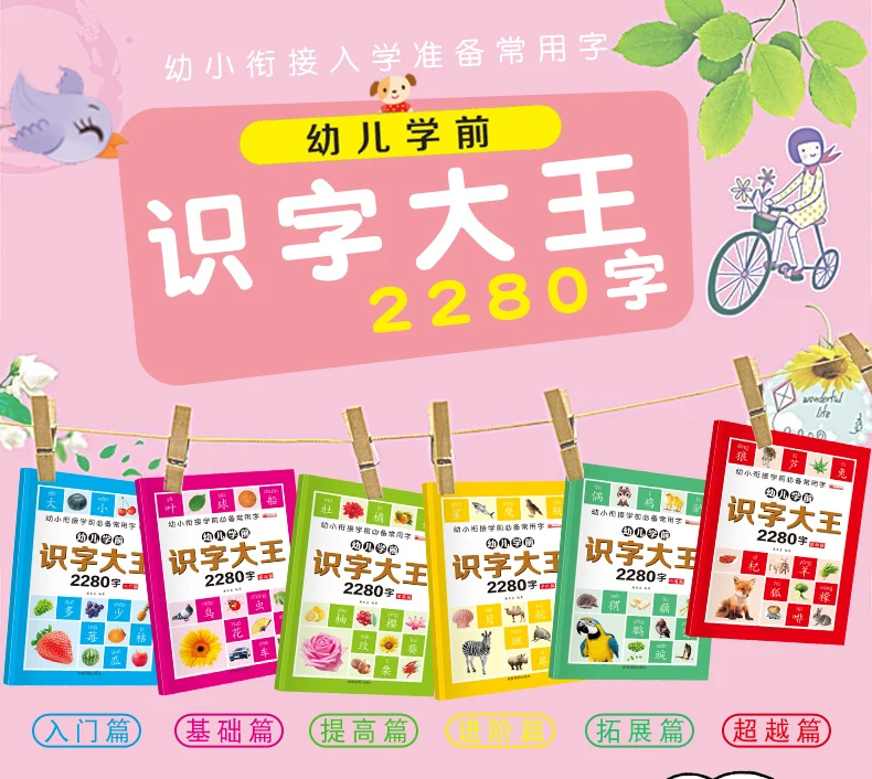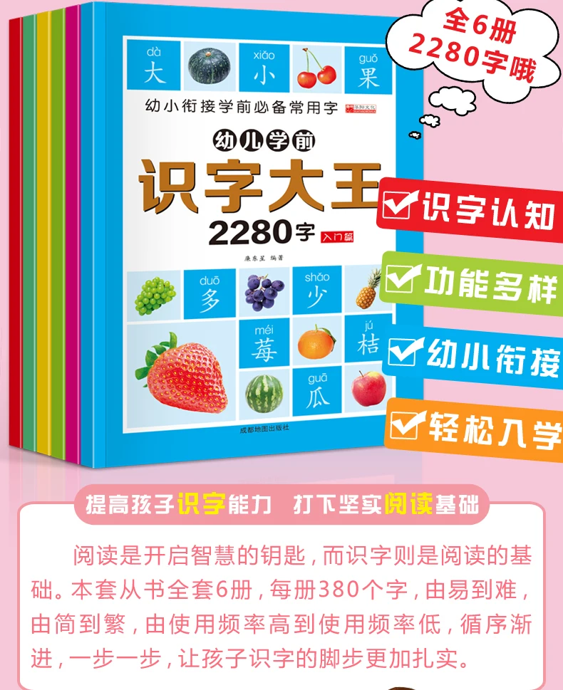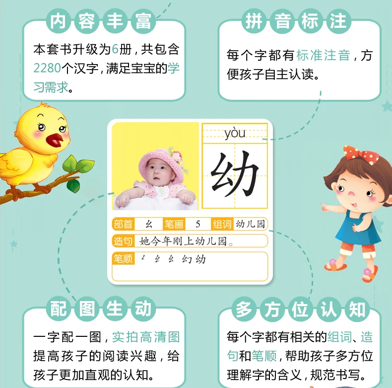 6Pcs/set 2280 Chinese Characters Learning Books Early Education for Preschool Kids Word Cards with Pictures & Pinyin Sentences