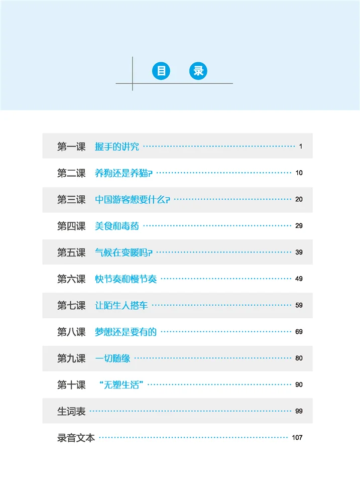 本教材为普及型汉语短期进修教材,主要面向来华短期进修教学项目,也适用于国内外其他各类普及型汉语进修教学项目。每册10课,每课3-4课时。