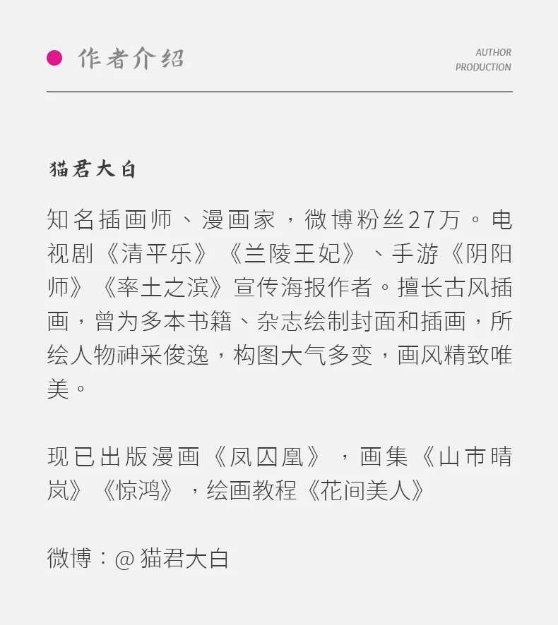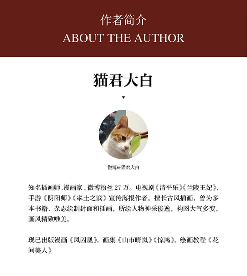 Mr. white cat, well-known cartoonist and illustrator in China. Especially good at drawing antique illustrations Some of covers and illustrations in books were his drawings. and he also draw posters for games or TV shows in China .